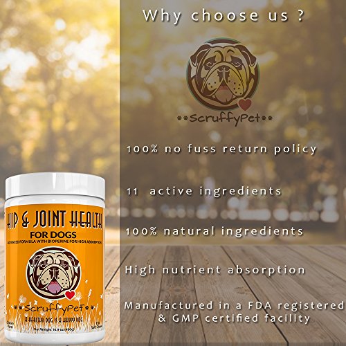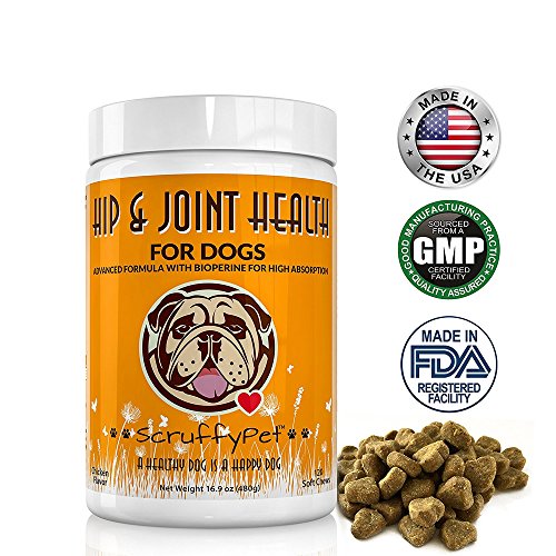 Get TREMENDOUS VALUE with ScruffyPet's ultimate Hip & Joint Dog Health Supplement, manufactured in the USA, at an FDA-Registered, GMP-Certified facility and rich in FAST-ABSORBED nutrients and vitamins, to offer your puppy the quality life they deserve!