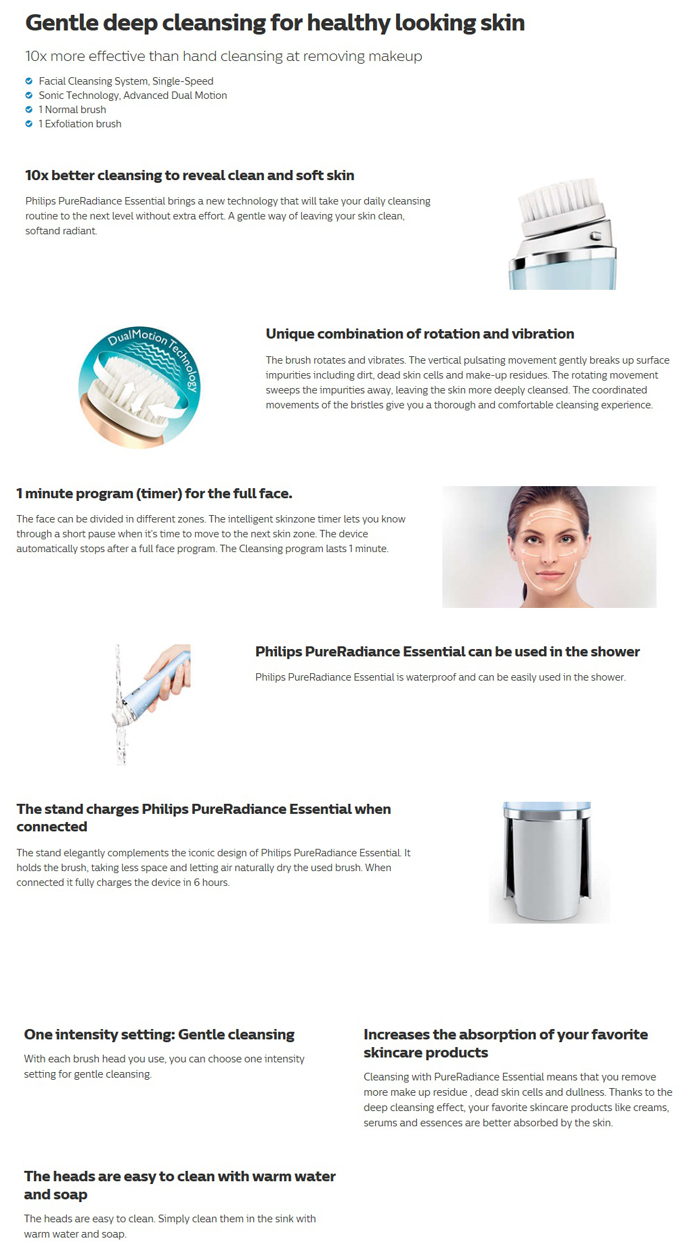 DualMotion Technology - The brush rotates and vibrates. The vertical pulsating movement gently breaks up surface impurities including dirt, dead skin cells and make-up residues. The rotating movement sweeps the impurities away, leaving the skin more deeply cleansed. The coordinated movements of the bristles give you a thorough and comfortable cleansing experience.