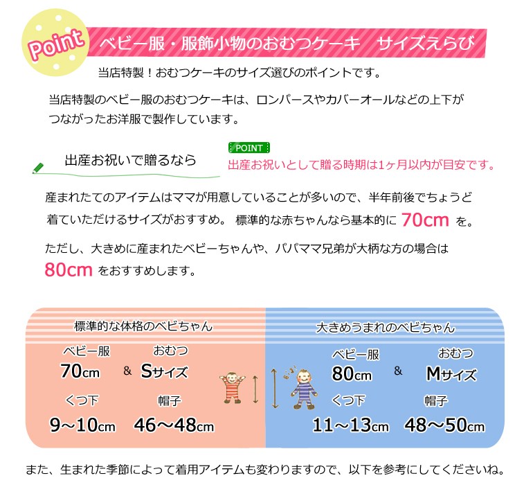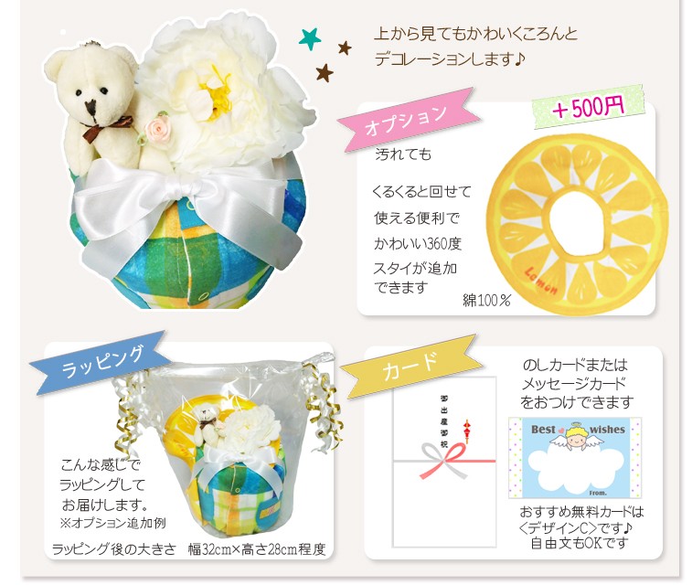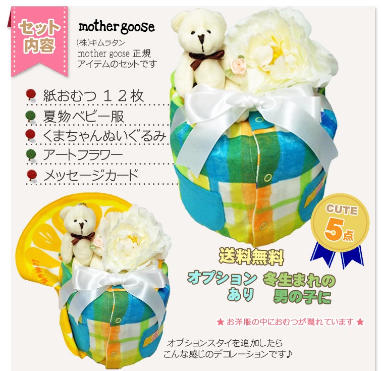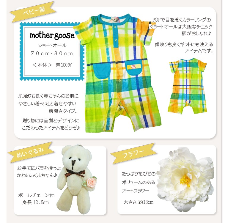 POPなカラーと大胆なチェック柄がかわいい、マザーグースのショートオールをおむつケーキに仕立てました。かわいいくまちゃんとボリュームのあるアートフラワーを添えて。冬生まれの男の子向けの出産祝いにぴったりです。オプション(+500円)でスタイを追加できます。ベビー服の中にはおむつが隠れています。 <使用するおむつ> パンパース(テープタイプ)22枚 S,Mから選択できます。<ベビー服> 70cm:9kg (標準的なベビちゃんの半年前後用) 80cm:11kg (おおきめベビちゃんの半年前後) から選択できます。<付属品> ・mother gooset ショートオール ・くまちゃんぬいぐるみ ・アートフラワー<のし、メッセージカード> 無料でお付けできます。(のしかカードかどちらかとなります) メッセージ内容は定型メッセージと自由な文面をお選びいただけます。<ご持参用手提げ袋> ご持参に便利な手提げ袋を無料でお付けできます。 ※ご注文者様ご自宅へのお届けに限ります。 <おむつケーキの本体サイズ> 幅17cm×高さ21cm出産祝い おむつケーキ ベビー服 冬生まれ 男の子