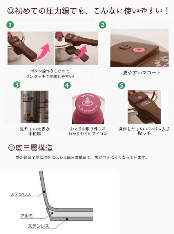 | 仕様 | 作動圧力:140kPa(2.38気圧) 調理温度:約126度 対応熱源:ガス火、IH(電磁調理器)200V 水の容量:最高水位線/約2L、豆類線/約1L 白米最大炊量:約3合 大豆最大煮量:約300g 食洗機:使用不可 底三層構造 |