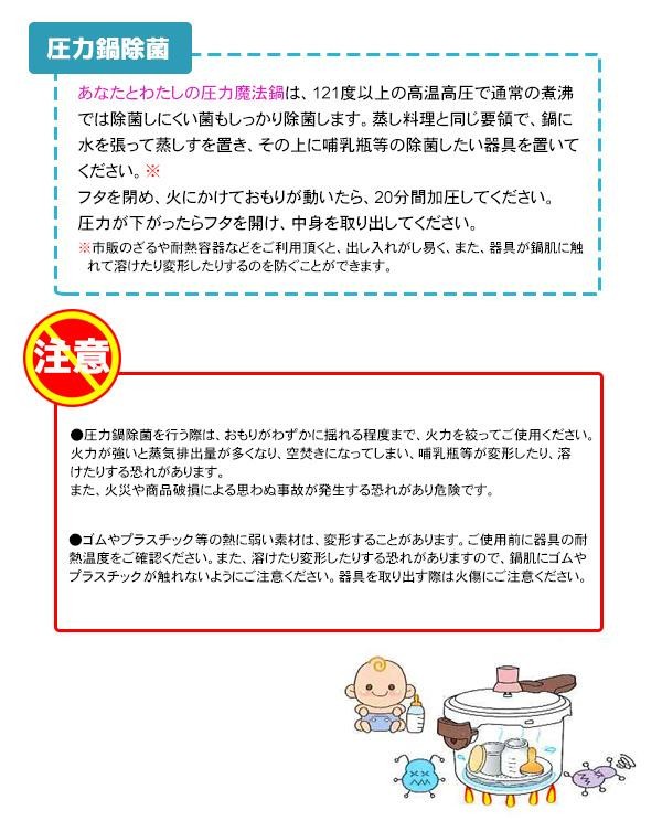 | 付属品 | 「なかよし家族の圧力鍋レシピ100」本 蒸しす 掃除ピン 取扱説明書 保証書(保証期間:1年) |