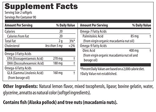 This unique omega 3-6-7-9 formula contains a blend of wild deep-sea sourced fish oils containing the omega-3 fats (EPA/DHA) in the TruTG form, the most important omega-6 fat (GLA from borage oil), the omega-7 fat palmitoleic acid and omega-9 fat oleic acid from certified virgin organic macadamia nut oil. EPA helps keep GLA metabolism in an anti-inflammatory mode. In addition, docosahexaenoic acid (DHA) plays as many important roles in human health as EPA, along with promoting brain wellness. Designs for Health fish oil products carry the TruTG seal, which are delivered in the form found in nature and are of superior TG potency. The TruTG seal guarantees a minimum 90% triglyceride-bound (TG) omega-3 fish oils, a level that is 40% - 50% higher than the industry standard for most TG fish oil concentrate products. As always, our fish oils are molecularly distilled and filtered to ensure purity and to maximize the removal of heavy metals, pesticides, solvents, PCBs, and other contaminants.Feature