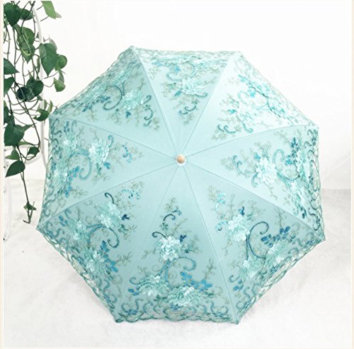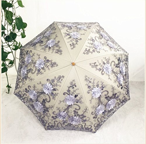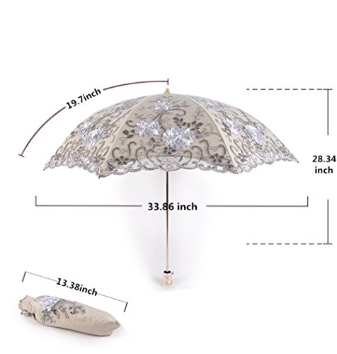 -. Brand : Honeystore -. ClothingSize : Medium -. Department : womens -. Feature : SPF: UPF 50+; Diameter: 33.86inches / 8 ribs made from strong fiber for extra support. / Made by 100% high-density water repellent polyester fiber and sunscreen fabric. / Can be used in rain and sunny day. / Honeystore is a registered brand and has its own Honeystore Tag and the Honeystore trademark. Make sure the seller is Honeystore to avoid buying fake items. -. Model : HSY1607C6 -. ProductGroup : Apparel -. ProductTypeName : LAGE -. Size : Medium -. Title : Honeystore Vintage Lace UV Sun Parasol Two Folding 3D Flower Embroidery Umbrella