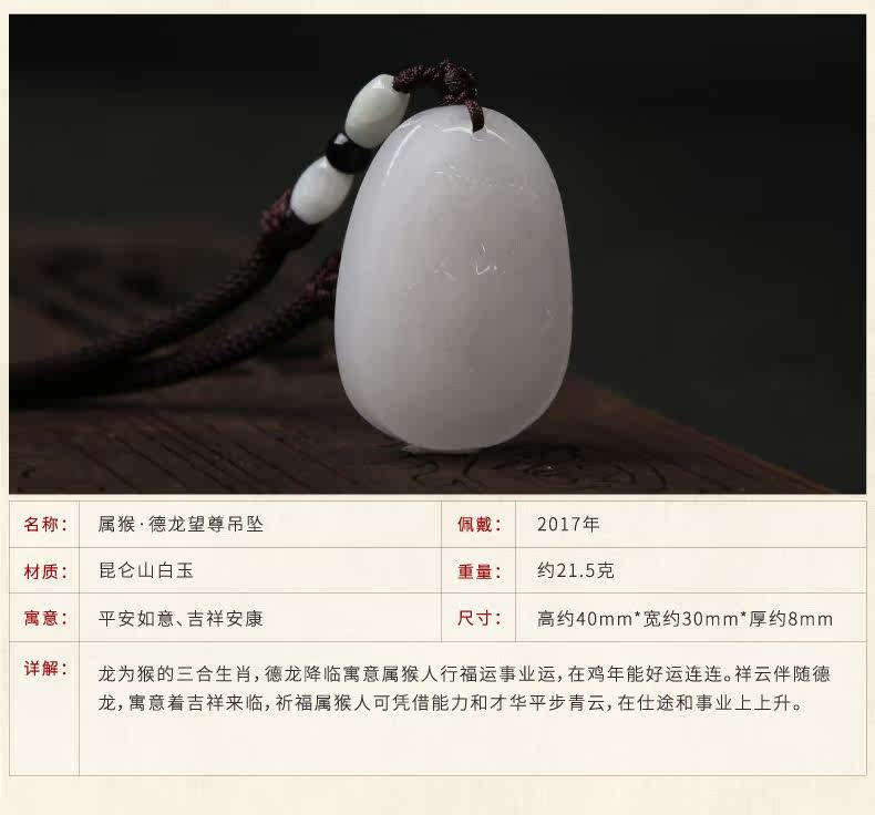属猴人可以佩戴【鼎风阁德龙望尊】玉坠保个人平安顺畅,德龙具有德高望重,威德兼有之意,象征属猴人在鸡年人缘旺盛,事业大成。德龙以大气,稳重的态势伴随祥云驾临,一只龙爪中握住一枚象征权力和财富的国玺,除了象征权力财富,宝玺也有辟邪化祟的功效,可保属猴人在鸡年避免小人作祟而带来的不顺,大大增加属猴人家运宅运,事业顺畅,平安如意。昆仑白玉亦为世间名器,可保平安,增运添财,配合【鼎风阁三合莲花】项链使用效果更佳。