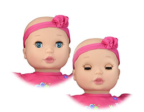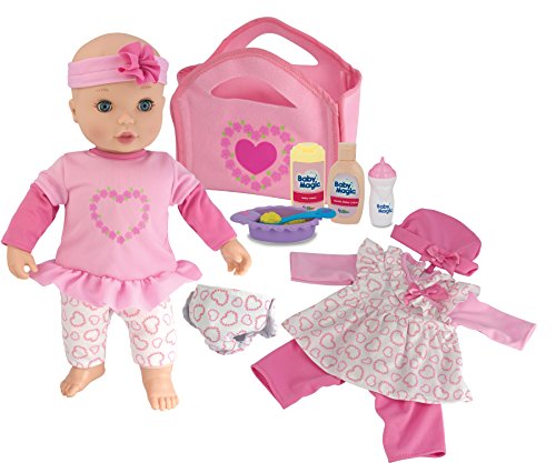 Care for and nurture a baby doll of your very own with this Baby Magic dress n play baby doll playset. With everything you'll need to look after a little one, this set makes it easy to pretend to care for a baby. Play with the interactive 16" baby doll, who giggles and blinks for lifelike actions when you wave your hand in front of her face. Give her a bottle before bed or serve her a delicious meal from the feeding dish. When a change is needed, you can unfold the diaper bag to reveal a changing pad. Before you know it, you'll be back to playing and laughing with your baby doll.Feature
