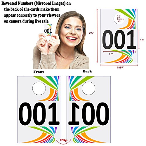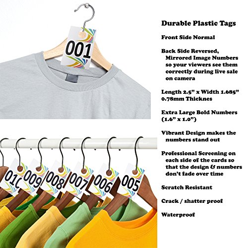 PLASTIC LIVE SALE NUMBER TAGS: Consecutive Numbers from 001 ~ 100 - One Side Normal / Other Side Backward Mirrored Image Numbers. Reverse numbers enable viewers to see the numbers correctly during Facebook Live Sale. EXTRA LARGE BOLD NUMBERS are printed permanently into the tags for people to see from far away. DIMENSIONS: 2.5” x 1.685”, 0.5” Hanger Hole, Thickness: 0.78mm