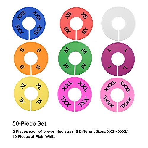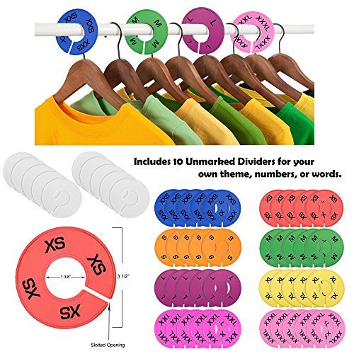 50-PIECE SET OF PLASTIC HANGER SIZE DIVIDERS: 5 Each XXS ~ XXXL (Printed on both sides) + 10 Plain for your own themes, words, or numbers. Durable Thick Plastic in Multiple Unique Colors that won't break easily