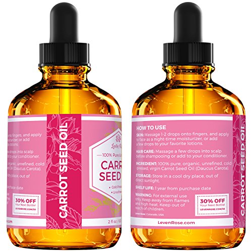 #1 TRUSTED Carrot Seed Oil - 100% Organic Natural (Cold Pressed, Unrefined) - 2 oz (2 ounce) by Leven Rose.Natural Carrot Seed Oil is chocked full of naturally-occurring beta carotene, vitamin A, vitamin E and more. Ideal for maturing or dry skin types, as well as damaged and brittle hair.