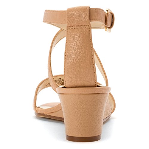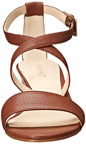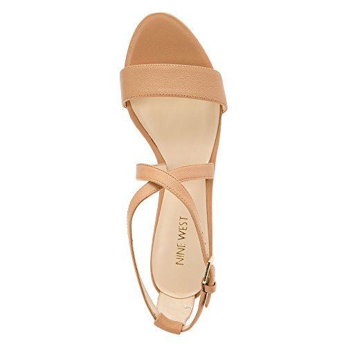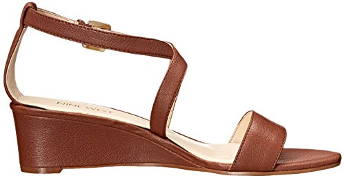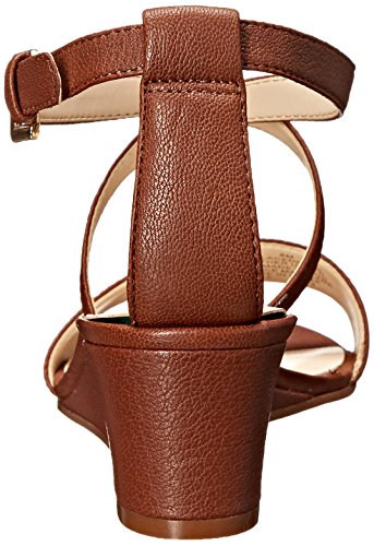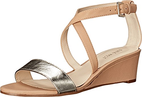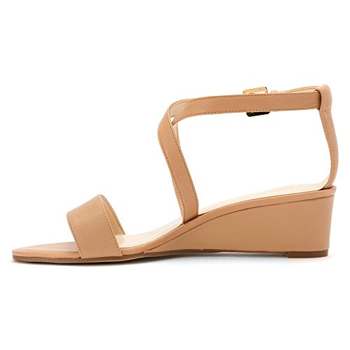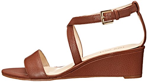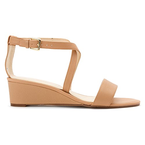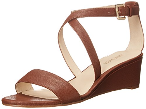 Sandal featuring leather crisscross vamp straps and covered-wedge heel