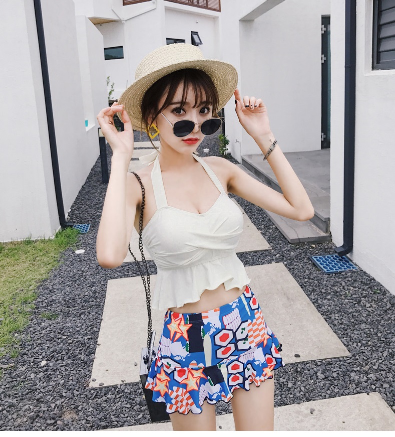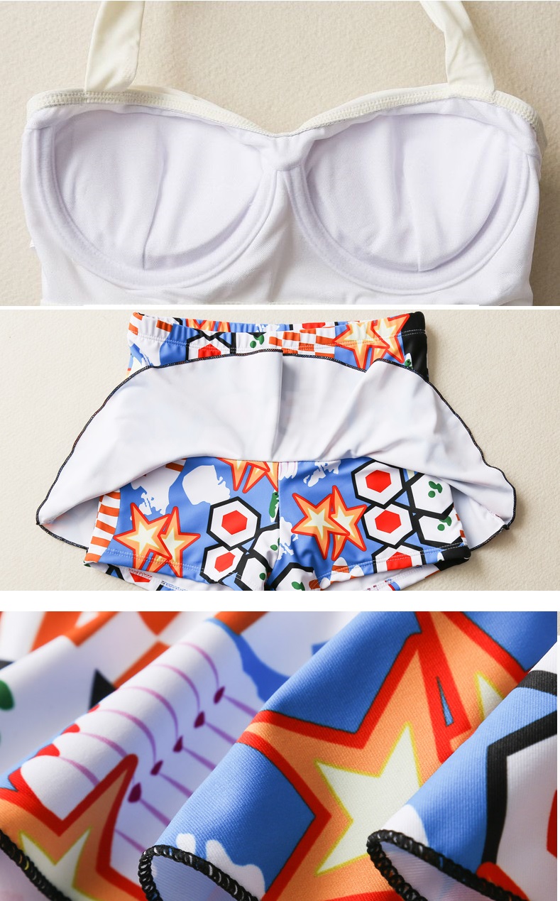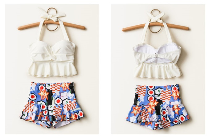 背中が開いたホルターネックトップと、ポップなデザインのボトムがセットになったブルー。