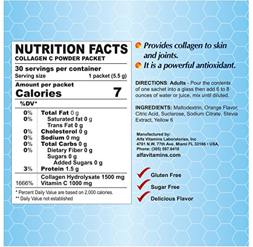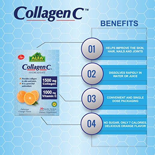 -. Feature : YOU GET A WHOLE MONTH'S SUPPLY: The box you will receive includes 30 individual packs that are very easy to carry with you in your bag anywhere you go! Use 1 each day to promote healthy skin in the most effective, purest way! / VERY EASY TO PREPARE: Preparing your richly flavored, delicious, Collagen drink will take no more than a couple of minutes! All you have to do is rip the powder packet open, empty the powder in a glass, fill it with 6 or 8 oz. of water or juice,dilute it and enjoy. As simple as that! / PROMOTE AN EXCELLENT HEALTH CONDITION: Apart from giving you a healthy skin, this highly nutritional Collagen supplement will help you support a good healthy joints. The vitamins, minerals and antioxidants blend will help you promote a healthy natural skin while also supporting your joints health. Follow a healthy lifestyle and make this dietary supplement part of your daily routine. / SETTLE FOR NOTHING LESS THAN THE VERY BEST: Stop wasting your money on questionable quality supplements that might prove dangerous for you! This Collagen C, nutritional powder supplement is the result of a proP.R.Ietary blend formulated in our facilities! Free of preservatives, artificial colors and flavors, sugar,soy, gluten, dairy and yeast, the non-GMO Collagen C supplement from us Alfa Vitamins is the perfect choice for anyone who is after top quality!