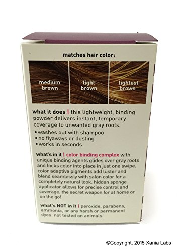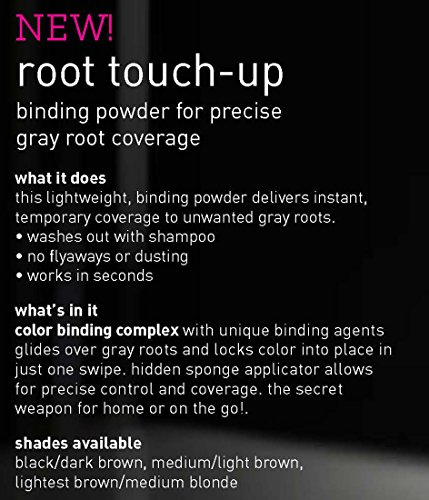Style Edit Root TOUCH-UP Binding Powder For Precise Gray Root Coverage 0.13oz (MEDIUM/LIGHT BROWN) is a color binding complex delivers instant, temporary coverage to unwanted gray roots. Washes out with shampoo, no flyaways or dusting. Fast acting color binding complex with unique binding agents glides over gray roots and locks color into place in just one swipe. Sponge applicator allows for precise control and coverage. shades available black/dark brown, medium/light brown, lightest brown/medium blondeFeature