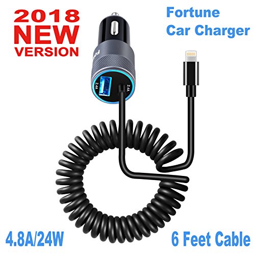-. Feature : • Fortune car charger adapter can Charge Two Devices Simultaneously. The 6 Feet Retractable Coiled Lightning cable and universal USB port could quickly charge for two devices at the same time in the car, with input: 12V-24V; output maximum up to 4.8A (2.4A Max Per Port), it can automatically adapt the output to each chargeable device accordingly. / • Built-with 6 Feet Retractable Coiled Lightning cable can extend to 6 feet (1.8m) if pulled tightly while it naturally length only approximately 4.7 inches (12cm), with first-rate shape retention, the Lightning cable is made by high purity oxygen-free copper core which ensures high speed transmission rate. Compatible with almost all Apple devices iPhone X/8/8 Plus 7/7 Plus/6s/6s Plus/6/6 Plus/SE/5s/5c/5/iPad/iPod, etc. / • The smart USB port could charging almost all brand mobiles such as Apple iPhones and devices, and also could charge Samsung Galaxy, Note, Nexus, HTC, Sony, LG, Tablet, navigators, digital cameras, tablets, MP3 players and more. / • Certified by CE & FCC will give you a fully safe and reliable using experience. It is compatible with all vehicle models' cigar lighter with DC 12-24V input, No interference issues for Radio, Bluetooth or Wi-Fi. Built-in smart IC technology prevents devices from overcharging, overheating and overcurrent etc. / • Excellent Design. Adopting and mixed with thousands buyers experience advices and other products advantage, Fortune car charger was special designed with compact, coiled retractable cable, non-slip pulling out, blue led indicator light etc., all those awesome characters will provide you a very convenience and happy daily life.