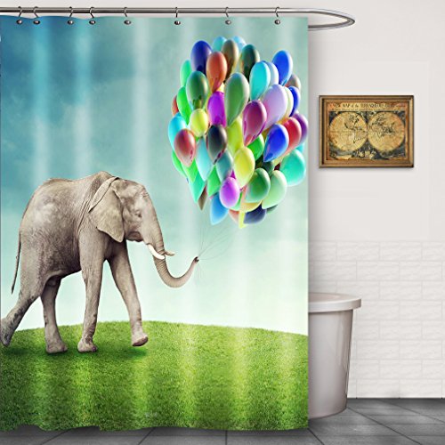 Funny Elephant Playing Balloons Fabric Shower Curtains by FOOG %100 Fabric Mildew Resistant Waterproof Digital Printing Custom Bathroom Decor-Green Teal Gray (70"Wx70"L)