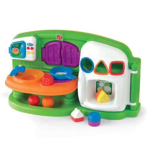 Cook-up-the-fun with the Sizzlin’ Shapes Kitchen. This fun kitchen has shape-sorting refrigerator doors and a drop-down sink great for learning and sorting. Its counter top features an electronic burner with real “cooking” sounds, clicker knob and faucet with real “water” sounds, and its microwave features real “working” door and “clicker” buttons. Complete with peek-a-boo window shutters, this kitchen includes 7 accessories: can, frying pan, egg, cheese, milk, orange and apple. Requires 2 "AAA" batteries (not included).