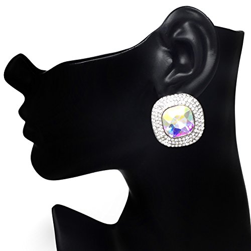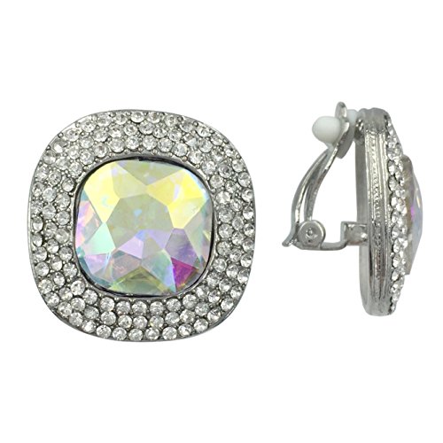 Large AB Iridescent Center Rhinestone Silver Tone Fancy Formal Prom Clip On Earrings (Square)