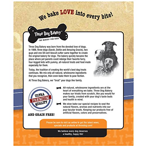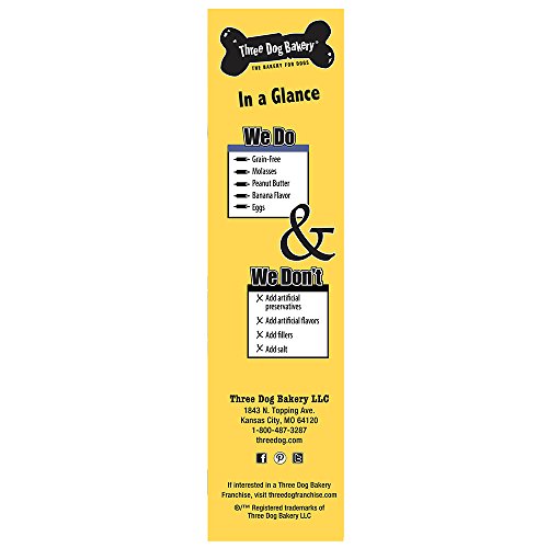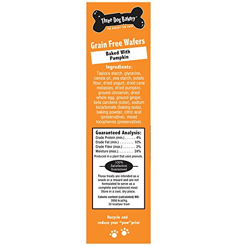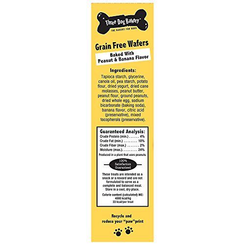 -. Binding : Misc. -. Brand : Three Dog Bakery -. Label : Three Dog Bakery -. Manufacturer : Three Dog Bakery -. PackageQuantity : 1 -. ProductGroup : Pet Products -. ProductTypeName : PET_SUPPLIES -. Publisher : Three Dog Bakery -. Studio : Three Dog Bakery -. Title : Three Dog Bakery Grain Free Wafers Baked Dog Treats, 13 oz