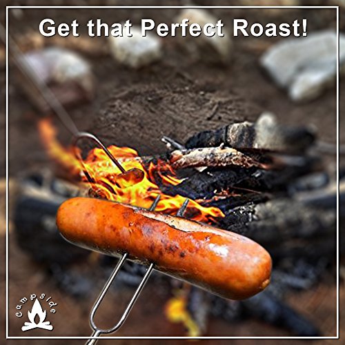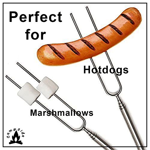 PERFECT ROAST: 32” Hot Dog Roasting Sticks telescopes in and out easily, features two prongs to prevent the hot dog, marshmallow, or other food from spinning or falling/melting off when roasting making it easy to get that PERFECT DRIPPING ROAST with no more limp or slipping dogs!