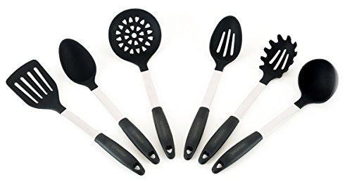 -. Title : Stainless Steel & Silicone Kitchen Cooking Utensil 6 Piece Set, Classic Black Color, Nonstick, Heat-Resistant. Ladle, Spoon, Pasta Claw, Turner Spatula, Slotted Spoon, and Straining Spoon