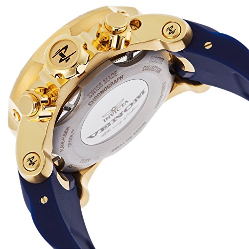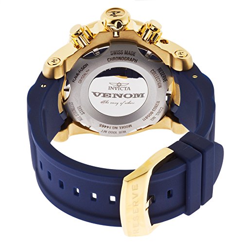 -. Binding : Watch -. Brand : Invicta -. Color : blue -. Department : mens -. EAN : 0886678151073 -. Feature : Chronograph functions with 60 second, 30 minute and 1/10 of a second sub dials; date indicator on inner bezel, day of the week and month windows / Blue dial with gold tone and white hands and hour markers; luminous; unidirectional bezel; screw-down crown and pushers; tachymeter; flame fusion crystal; 18k gold ion-plated stainless steel case; blue polyurethane strap with 18k gold ion-plated stainless steel inserts / Swiss-quartz Movement / Case Diameter: 54mm / Water Resistant To 3280 Feet -. Label : Invicta -. Manufacturer : Invicta -. Model : 14465 -. MPN : 14465 -. NumberOfItems : 1 -. PackageQuantity : 1 -. PartNumber : 14465 -. ProductGroup : Watch -. ProductTypeName : WATCH -. Publisher : Invicta -. Studio : Invicta -. Title : Invicta Men's 14465 Venom Analog Display Swiss Quartz Blue Watch -. UPC : 886678151073