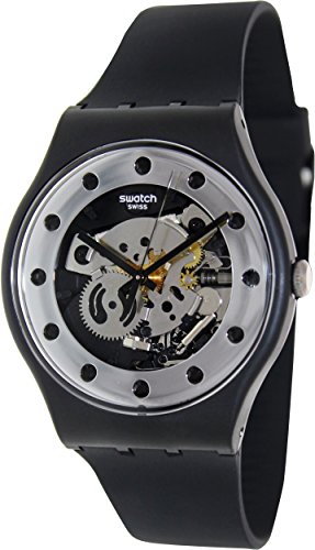 -. Binding : Watch -. Brand : Swatch -. Color : Black -. Department : unisex-adult -. EAN : 0054362633390 -. Feature : Modern watch featuring black case with silver-tone bezel and numberless skeleton dial / 42.7-mm plastic case with plastic dial window / Quartz movement with analog display / Silicone band with buckle closure / Water resistant to 30 m (99 ft): In general, withstands splashes or brief immersion in water, but not suitable for swimming -. Label : Swatch -. Manufacturer : Swatch -. Model : SUOZ147 -. MPN : SUOZ147 -. PackageQuantity : 1 -. PartNumber : SUOZ147 -. ProductGroup : Watch -. ProductTypeName : WATCH -. Publisher : Swatch -. ReleaseDate : 2014-09-30 -. Studio : Swatch -. Title : Swatch Unisex SUOZ147 Silver Glam Analog Display Quartz Black Watch -. UPC : 054362633390