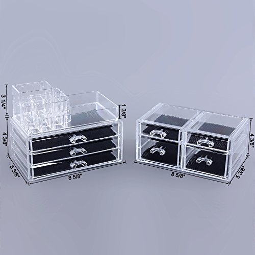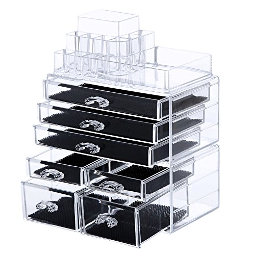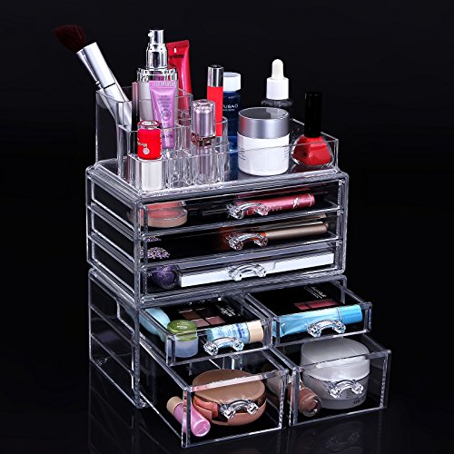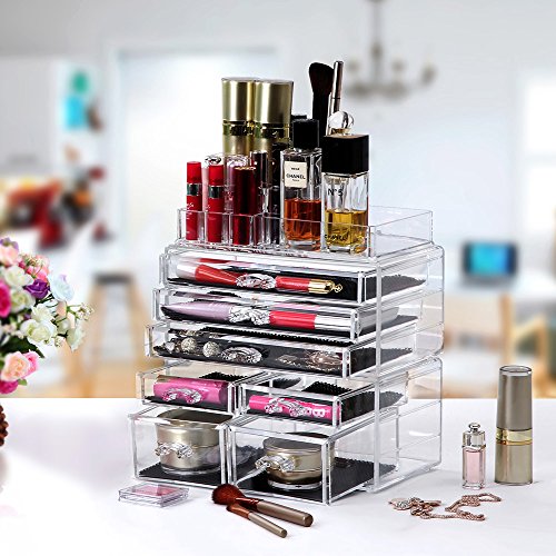 Binding : Kitchen Product Description With 11 multi-size sections and 7 different-depth drawers for make-up essentials and jewelry, this Songmics makeup organizer keeps everything accessible and easy to find at your fingertips in clear, durable acrylic. This practical organizer occupying little space on your dresser/counter but enough to holds many shapes and sizes of your favorite moisturizer, blush, foundation, eye shadow, liner, mascara, lipstick, brushes, nail polishes, jewelry and more, while adding a decorative touch to your dressing table or bathroom countertop. 7 removable black mesh liner keeps jewelry protected and in place and can be easily rinsed off when cleaning out the drawers. Specifications: - Color: Clear - Material: Acrylic - 11 multi-size sections on the top for lipsticks, nail polish,brushes,mascara,blush, foundation, etc - 7 different-depth drawers for suitable cosmetics and jewelry - Assembly: NO - Product Dimensions: 9 1/2"L x 5 7/8" W x 11 3/4" H (24×15×30cm) - Weight: 4.9 pounds (2.2Kg) Shipping List: - 1 x Makeup Organizer Set (1 top makeup organizer, 1 bottom box with 3 drewers, and 1 bottom box with 4 drawers) 0 |