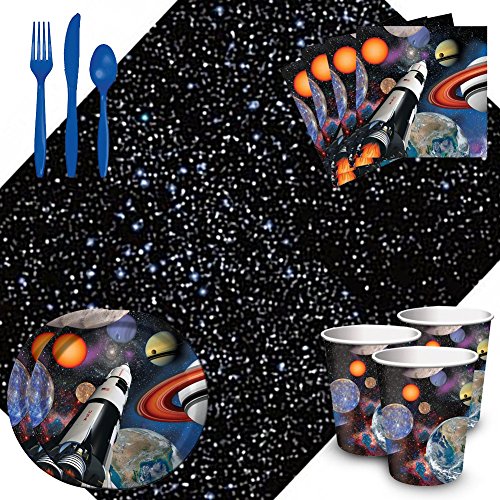 -. Title : Space Blast Party Supplies Pack for 16 Includes: Plates, Napkins, Cups, Tablecover, and Cutlery
