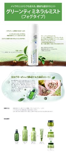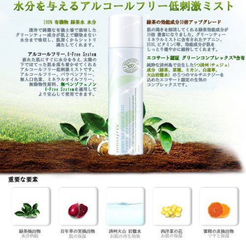 -. Feature : Innisfree Green Tea Mineral Mist / 100% Organic Green tea water / Innisfree Green Tea Mineral Mist is a hypoallergenic ethanol-free facial mist. / Containing organic Jeju green tea moisture, it immediately replenishes moisture to your thirsty skin. / 6-free system - No Ethanol, No artificial pigments, No paraben, No benzophenone, No ethanol, No animal base materials, No mineral oil