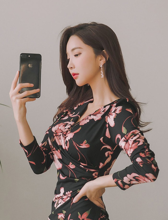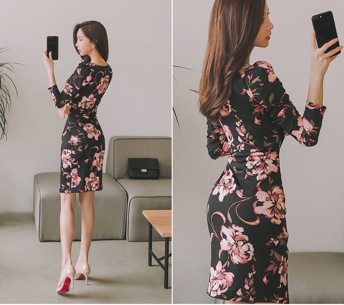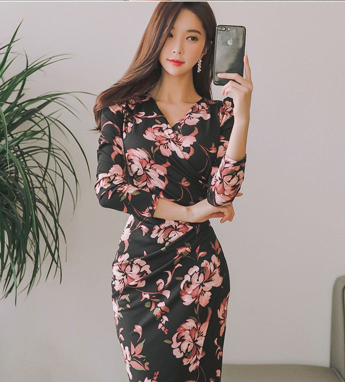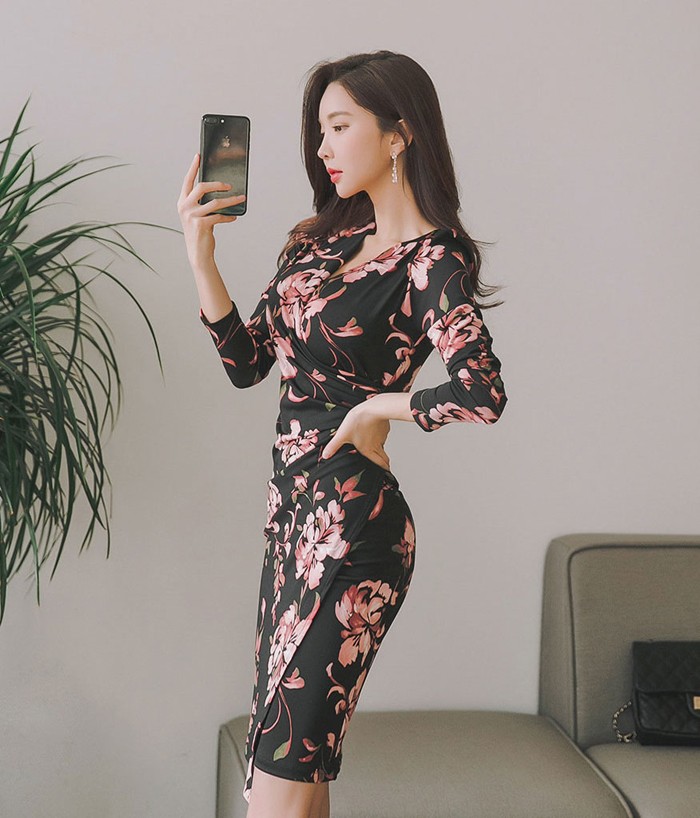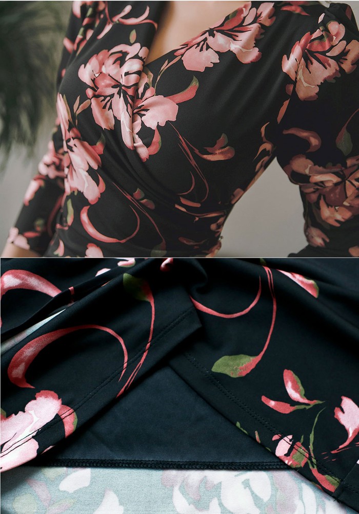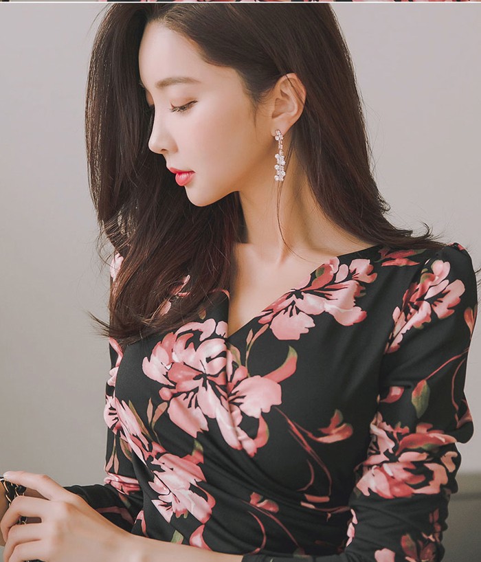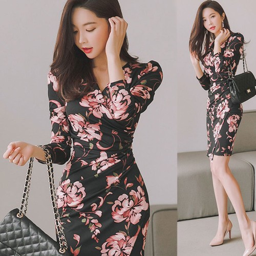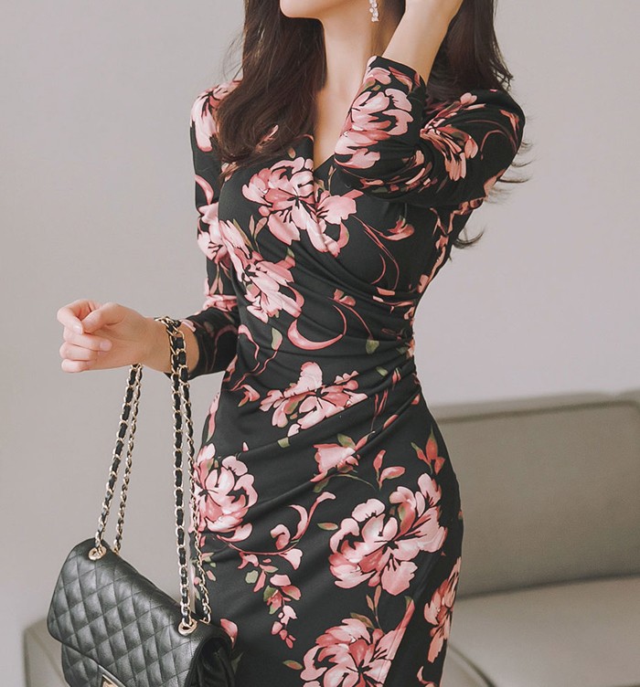 商品名:ワンピース カシュクールワンピ 花柄 セクシー フラワー シャーリング きれいめ 通勤