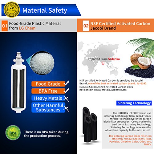 - 【NSF CERTIFIED】Golden Icepure Brand Filters was Tested and Certified by NSF International against NSF/ANSI Standard 42 for material and structural integrity requirements.