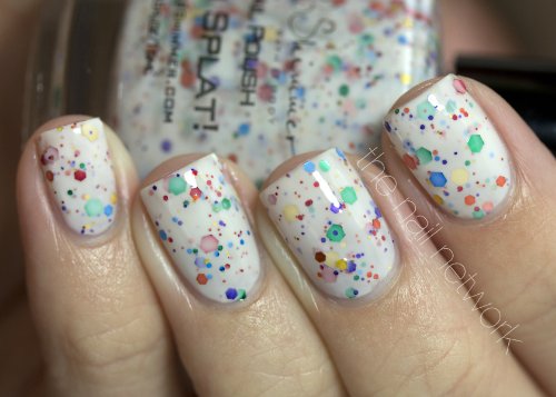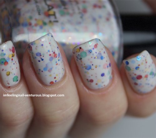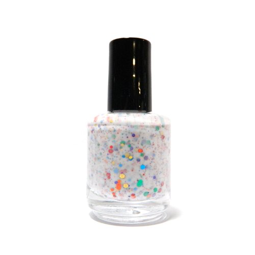 Studio : KBShimmer Publisher : KBShimmer Binding : Misc. Product Description A white jelly polish loaded with the 6 rainbow colors in many different sizes. This reminders me of a painters drop cloth, or an abstract splatter painting. Best in 3 thin coats, you can also layer over a coat of white if you want to ensure there is no visible nail line. 0