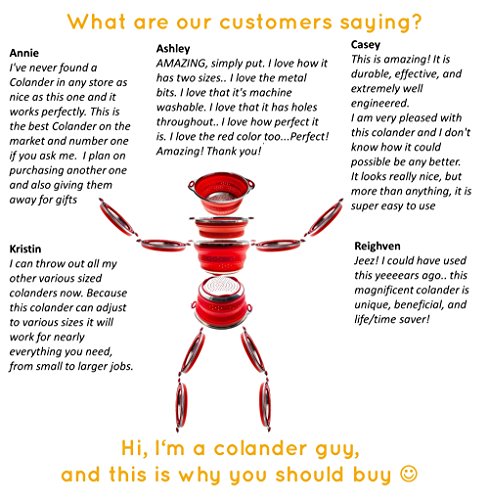 -. Feature : 5x BETTER THAN A NORMAL COLANDER: 1) Collapsible to 1.2'' saving 75% of space, 2) 2-in1: large or small strainer, 3) Colorful, sleek look makes cooking fun, 4) Lightweight, 5) Does not slide around / STRAINS EVERYTHING - pasta, rice, veggies, berries... Over 330 holes for fast and easy drainage. EASY CLEANING, whether by hand or in a dishwasher, thanks to a NON-STICK surface. NO RUST ever! / 3 QUART volume feeds 6 PEOPLE, perfectly SAFE & BPA-free. DURABLE and STURDY for many years of happy usage by the whole family. NON-SLIP feet will keep colander above sink level and prevent sliding / FREE BONUSES: Top Quality COLLAPSIBLE FUNNEL +2 eBOOKS: "Cook pasta like a real Italian" (making pasta "al dente" from A-to-Z in 10 steps) and "10 practical & helpful tips and tricks for your kitchen" / 110% MONEY-BACK PROMISE for 90 days from purchase. We are confident you will be as satisfied as the customers before you. If not, we offer 110% of your investment back, hassle-free. YOU RISK NOTHING