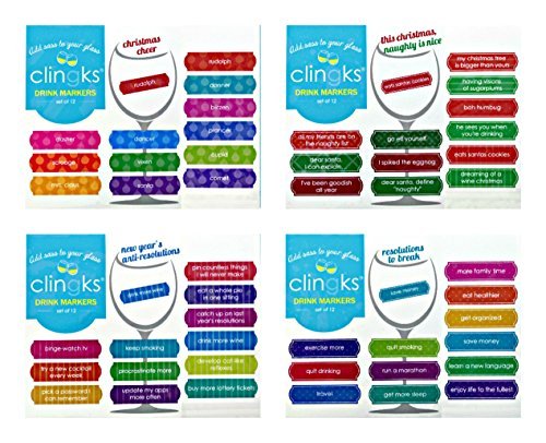 -. Feature : Clingks® are an edgy and fun alternative to wine charms. A great conversation starter to encourage mingling! / Add sass to your glass! Modern and Fun way to find your drink at a party. Find your drink by Color, Pattern, or Sassy saying / Leaves no residue - safe for all styles of drinkware. Made of Vinyl Static Cling. Cling to any non-porous surface: glass, aluminum, ceramic & plastic. / Reusable Designs - reuse from glass to glass and from one party to the next. Dimensions: 1/5 x 2-Inch - 12 Markers in a set. / Set includes Christmas Cheer, This Christmas, Naughty is Nice, New Year's Anti-resolution and Resolutions to Break - 48 drink markers total. NOT Dishwasher Safe, NOT Microwave Safe. Made in USA