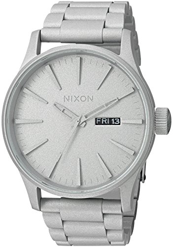There's no chain of command here; it's all you with The Sentry SS watch from Nixon®. Part of the Primer Collection. Custom solid stainless steel case. Hardened mineral crystal. Triple gasket crown with enamel fill, stainless steel screw down caseback and spring pin lugs. Tapered custom solid stainless three-link bracelet with micro adjust double locking clasp. Miyota Japanese three-hand quartz movement with day and date display. Dial features:• Applied indices.• Printed seconds track.• Custom molded hands with luminous fill. Water resistant up to 100 meters. Imported. Measurements: Case Height: 42 mm Case Width: 42 mm Case Depth: 12 mm Band Width: 8⁄9 in Band Circumference/Length: 8 3⁄4 in Weight: 4.6 oz This product may have a manufacturer's warranty. Please visit the manufacturer's website or contact us at warranty@support.zappos.com for full manufacturer warranty details.Feature