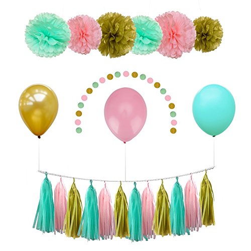 Pink Gold Mint Party Decorations, Tissue Paper Flowers & Craft Pom Poms + Tassel Garland + Birthday Balloons – Party Supplies and Party Decorations Kit for Wedding, Birthday, Baby Shower