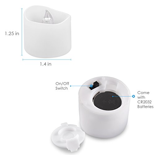 - 12 PACK SET & EASY TO USE: The price is for 12 flameless candles. Great helpful to save your money. The LED tea lights comes with batteries which can be replaced easily via the tab at the bottom. On / Off switch for convenient operation at the bottom of the candle. Each candle lamp can be operated independently.