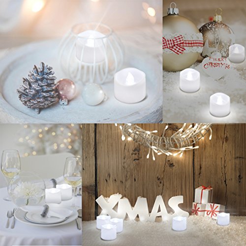 - ROMANTIC ATMOSPHERE: AMIR flameless LED tea light candles create the glowing and flickering effect like a real candle. The warm white light are ideal for decorations. Perfect for Christmas, Party, Birthday, Home decorations, Bars, Wedding, Seasonal & Festival Celebration, Gift, etc.