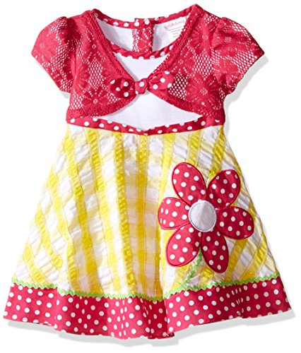 Knit to seersucker dress with mock pink cardigan and flower applique