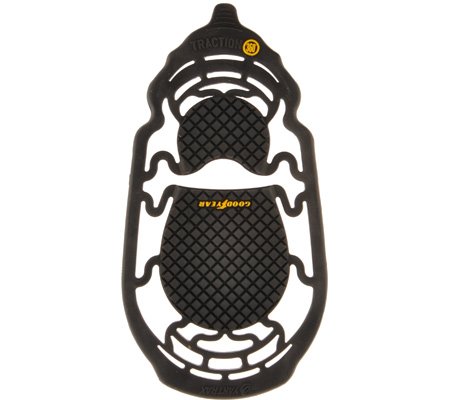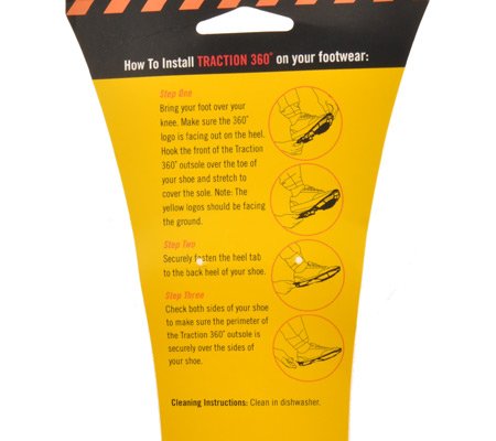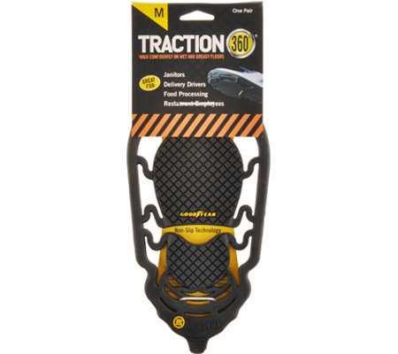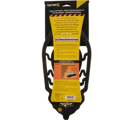 Traction 360° provides traction on wet and greasy floors. The unique design will ensure a secure fit on any type of footwear, while the ultra grip technology provides better slip resistance than any footwear available. Don't wear uncomfortable footwear for work, wear your favorite footwear with Traction 360°. Indoor traction devices for footwear, namely, elastomeric and rubber webbing with traction pods to facilitate walking on indoor surfaces. Adapts to all footwear. Works in extreme temperatures, and is oil and gas resistant. Patented non-slip design.