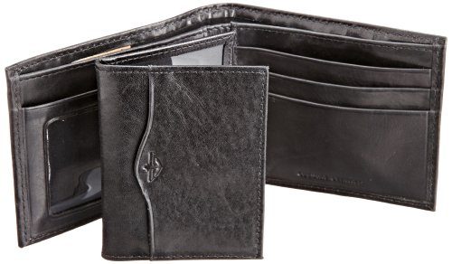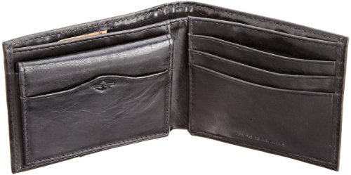 -. Feature : Leather bifold wallet with double-stitched trim and debossed logo featuting removable leather passcase / Three card slots, one bill compartment, and two ID windows