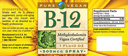 Pure Vegan Vitamin B12 Methylcobalamin 500 mcg spray is an excellent option for vegans and or vegetarians who may suffer from a vitamin B12 deficiency