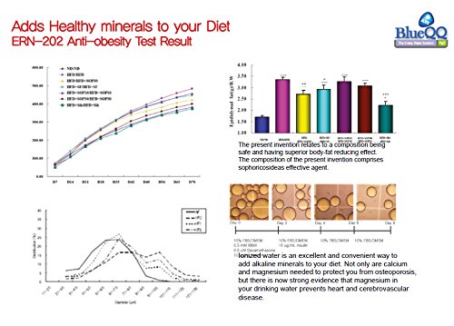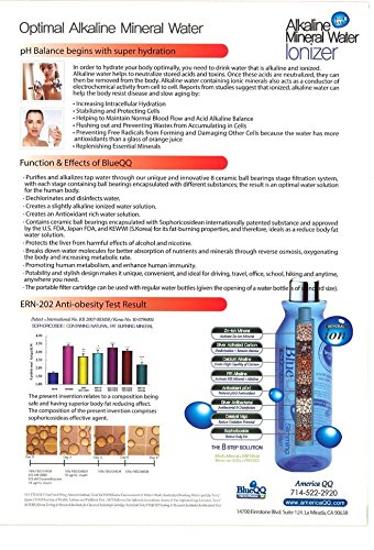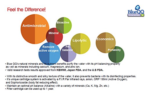 Blue QQ's built in filter cartridge rapidly transforms ordinary tap water into mineral rich Alkaline water. With its distinctive smooth and silky texture of the water, it also prevents bacteria with its disinfecting properties. It's unique cartridge system is activated by a F.I.R Far infrared rays, anion, ORP 199ml (Active Oxygen),and Sophoricoside (body fat reducing effect). Maintain an optimal ph balance (Alkaline) with a variety of minerals (Ca, K, Mg, Zn, etc.). Fortifies ordinary tap water with: Zinc ion Mineral A powerful antioxidant with its immune boosting properties, plays a vital role in digestive and endocrine systems. Silver Activated Carbon Dechlorinates and disinfects water by absorbing impurities. Calcium Alkaline Counteracts against aging bone loss and aids for better calcium absorption in tissues and organs. Antioxidant Fights oxidative stress, reduces signs of aging. Silver Antibacterial Flushes out and prevents wastes form accumulating in cells. Catalyst Magnesium Breaks down water molecules for better absorption of nutrients and minerals through reverse osmosis, oxygenating the body and increasing metabolic rate. FIR Alkaline Emits abundant amount of essential minerals into the water solution and slightly increases the water's pH level into the optimal pH level of 7.8; this stage, furthermore, actively creates an ionized solution. Sophoricoside An internationally patented substance and tested by the U.S.FDA guideline, Japan FDA, and KEWWI to have body fat cell reducing effect by lessening fat molecules.Feature