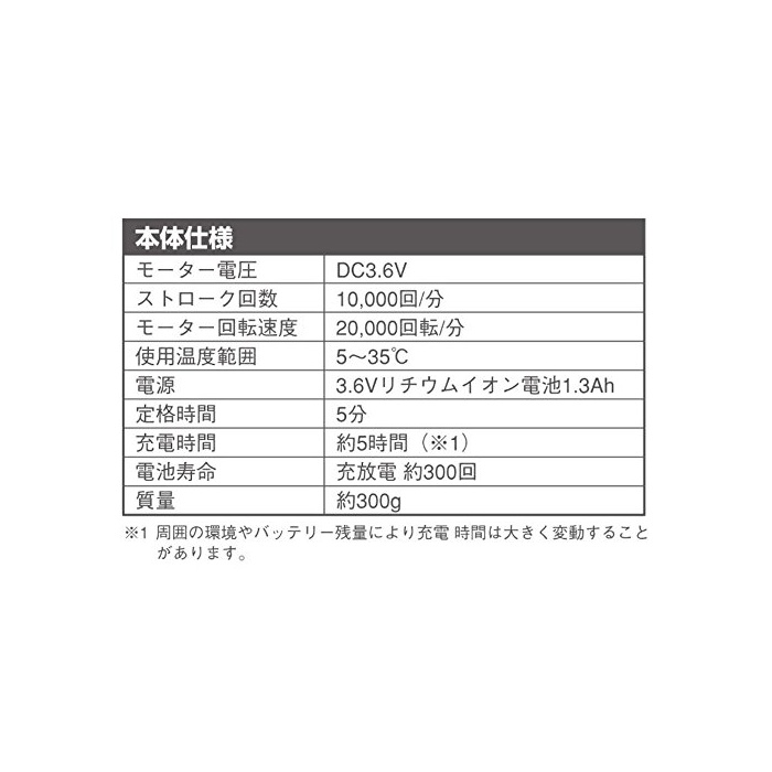충전 시간:약5시간(주위의 환경이나 배터리잔량에 의해 충전 시간은 크게 변동하는 일이 있습니다.) 전지 수명:충방전 약300회