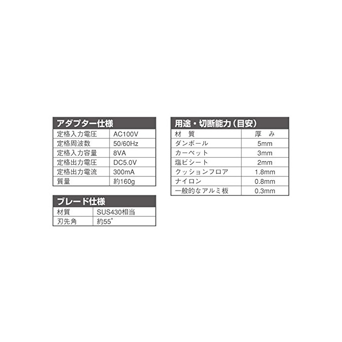 절단 능력(기준)/골판지:5mm 카펫트:3mm 염화비닐 씨트:2mm 쿠션 플로어:1.8mm 나일론:0.8mm 일반적인 알루미늄 판:0.3mm