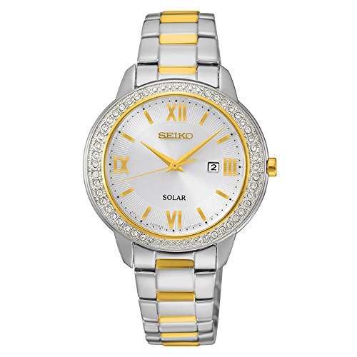 -. Feature : Display: Analog, Movement: Japanese Quartz, Crystal: Mineral. / Case Material: Stainless steel, Band Color: Gold and Silver, Band Type: Bracelet, Dial Color: Silver, Shape: Round. / Powered by light energy,6 month power reserve once fully charged, Date calendar. / Curved Hardlex crystal, Made with Swarovski® Crystals. / Directional, exciting and diverse, the Seiko Collection makes and breaks the fashion rules. Scouring the globe for inspiration, our Design Team is inspired by fashion's most covetable trends; providing you with a cutting edge wardrobe season upon season.