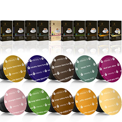✔ INCLUDES - ✪ Brasile Blend Dolce - Intensity 3 ✪ Ristretto Blend Forte - Intensity 10 ✪ Messico Blend Forte - Intensity 9 ✪ Tarrazu Forte - Intensity 8 ✪ Decaf Peru Dolce - Intensity 3 ✪ Nicaragua Mezzo - Intensity 7 ✪ Lungo Latino Mezzo - Intensity 7 ✪ Lungo Arabica Forte - Intensity 9 ✪ Soffio Caramello - Caramel - Intensity 5 ✪ Soffio Vaniglia - Vanilla - Intensity 5