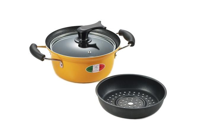 深型なので煮込み料理はもちろん、付属の目皿を使って蒸し料理にもお使い頂けます。蓋はガラス蓋なので調理の様子が見えて大変便利です。また鍋内面と目皿はフッ素樹脂加工でお手入れ簡単です。 |