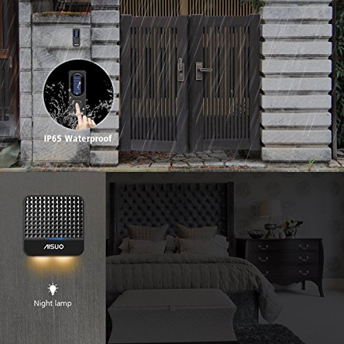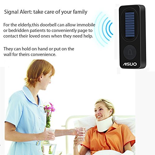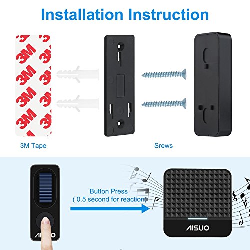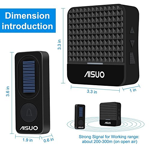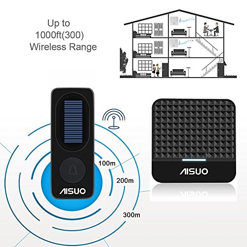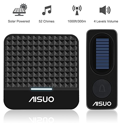 Aisuo Doorbell Kit - Solar Wireless Doorbell, LED Indicator & Flashing Alert Light, 1000-feet Signal Range, 4 Adjustable Volumes and 52 Chimes, No Batteries Required, Outdoor/ Indoor (Black).