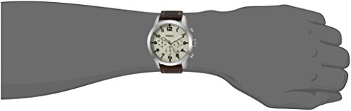 Studio : Fossil Watches Publisher : Fossil Watches Binding : Watch Product Description Stainless steel case with a black leather strap. Fixed stainless steel bezel. Cream dial with luminous silver-tone hands and Arabic numeral hour markers. Minute markers around the outer rim. Dial Type: Analog. Luminescent hands and markers. Date display between the 4 and 5 o'clock positions. Chronograph - three sub-dials displaying: 60 second, 60 minute and 24 hours. Quartz movement. Scratch resistant mineral crystal. Solid case back. Case size: 44 mm. Case thickness: 12 mm. Round case shape. Band width: 22 mm. Band length: 7.8 inches. Tang clasp. Water resistant at 50 meters / 165 feet. Functions: chronograph, date, hour, minute, second. Additional Info: Supplied with three straps: black leather, brown leather and multi-color nylon. Casual watch design. Fossil Pilot 54 Chronograph Leather And Nylon Box Set FS5182SET. 0