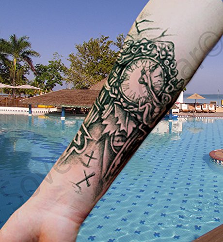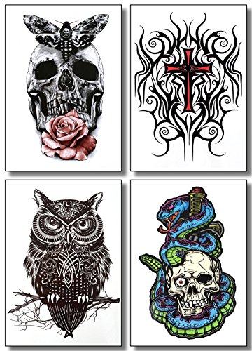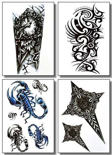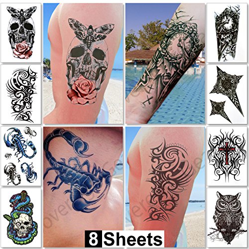 - 8 LARGE SHEETS OF DIFFERENT TATTOO DESIGNS. includes: scorpion, stars cross, skull & moth, clock death forearm, skull & snake, cross, owl and tribal. Use several tattoos to create full arm sleeve